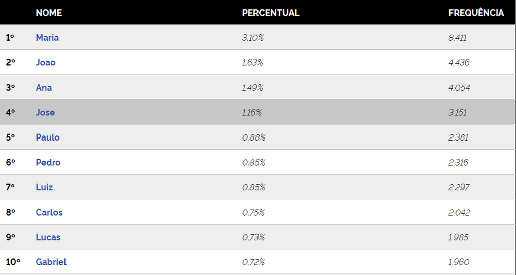 Os nomes Maria e José lideram o ranking nacional. No país, há mais de 12 milhões de Marias (6% da população) e 5 milhões de Josés (2,5%). O estudo identificou 128.125 nomes próprios em uso no Brasil, sendo 124 mil deles com pelo menos 20 registros.