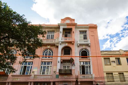 Importante prédio histórico de Santa Maria, o edifício João Fontoura Borges, popularmente conhecido como prédio da SUCV – na esquina da Rua Venâncio Aires com a Avenida Rio Branco –, começou a receber a pintura nas paredes externas. O trabalho de revitalização começou em fevereiro deste ano. Segundo o Executivo, a cor utilizada é a mesma da Casa de Cultura Mário Quintana, em Porto Alegre, sendo um tom rosa, semelhante à original do prédio.