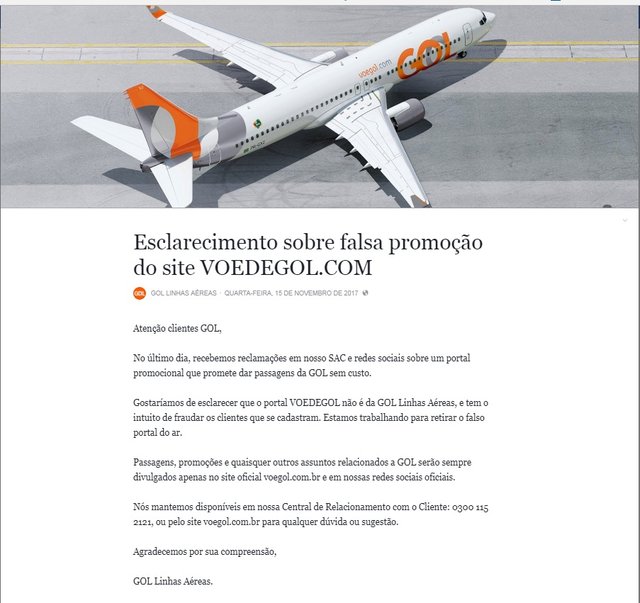 Nesta quarta-feira, a Gol publicou uma nota oficial em sua página de Facebook esclarecendo que esse site não tem relação com a empresa e que todas promoções e outras informações são divulgadas no site voegol.com.br. A companhia explica, ainda, que em casos de dúvidas os clientes podem ligar para o telefone 0300 115 2121. Confira a íntegra da nota:
