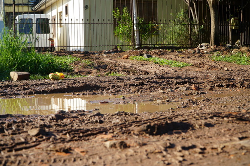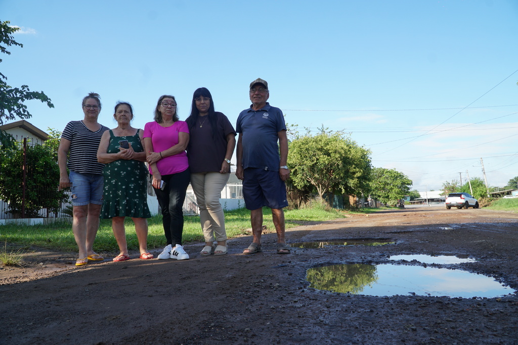 A rua de chão batido apresenta buracos e acúmulo de água com coloração escura e com mau cheiro. Segundo os relatos dos moradores à rádio CDN (93,5 FM), uma intervenção recente na rede de saneamento teria danificado a tubulação pluvial, impedindo o escoamento adequado. A comunidade reivindica uma solução.