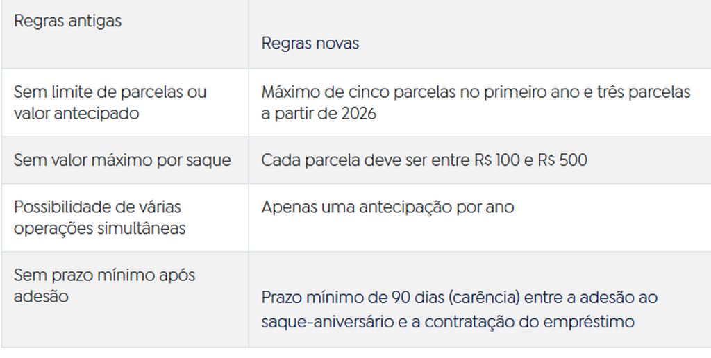 As novas regras que limitam a antecipação do saque-aniversário do Fundo de Garantia do Tempo de Serviço (FGTS) entram em vigor neste sábado (1º). A mudança, aprovada pelo Conselho Curador do FGTS e implementada pela Caixa Econômica Federal, altera o funcionamento dos empréstimos que permitem ao trabalhador antecipar valores futuros do fundo.