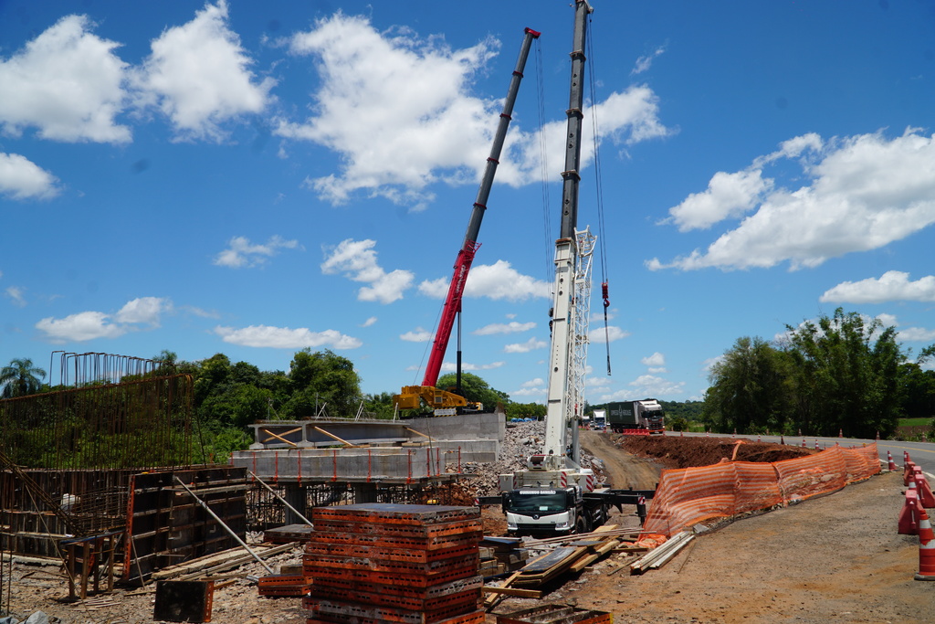 A obra da ponte sobre o Arroio Grande, em Santa Maria, avançou nas últimas semanas, com frentes simultâneas de trabalho. Máquinas e operários atuam na construção dos aterros laterais, que são mais altos que a pista antiga, além da execução de pilares e estruturas de concreto. A nova ponte terá maior altura e extensão para resistir a enchentes. Conforme a Rota de Santa Maria, a expectativa de conclusão é final de fevereiro, a depender das condições climáticas.