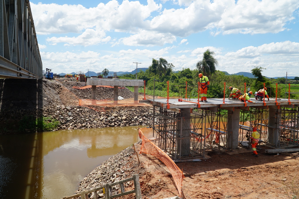 Na ponte do Arroio Barriga, entre Paraíso do Sul e Novo Cabrais, as obras também seguem no próximo ano. A base de pedra, mais alta que a pista antiga, já foi concluída e recebe camadas finais antes do asfaltamento. A estrutura da ponte avança com a instalação de blocos, pilares e vigas centrais, além de galerias laterais para ampliar a vazão da água.