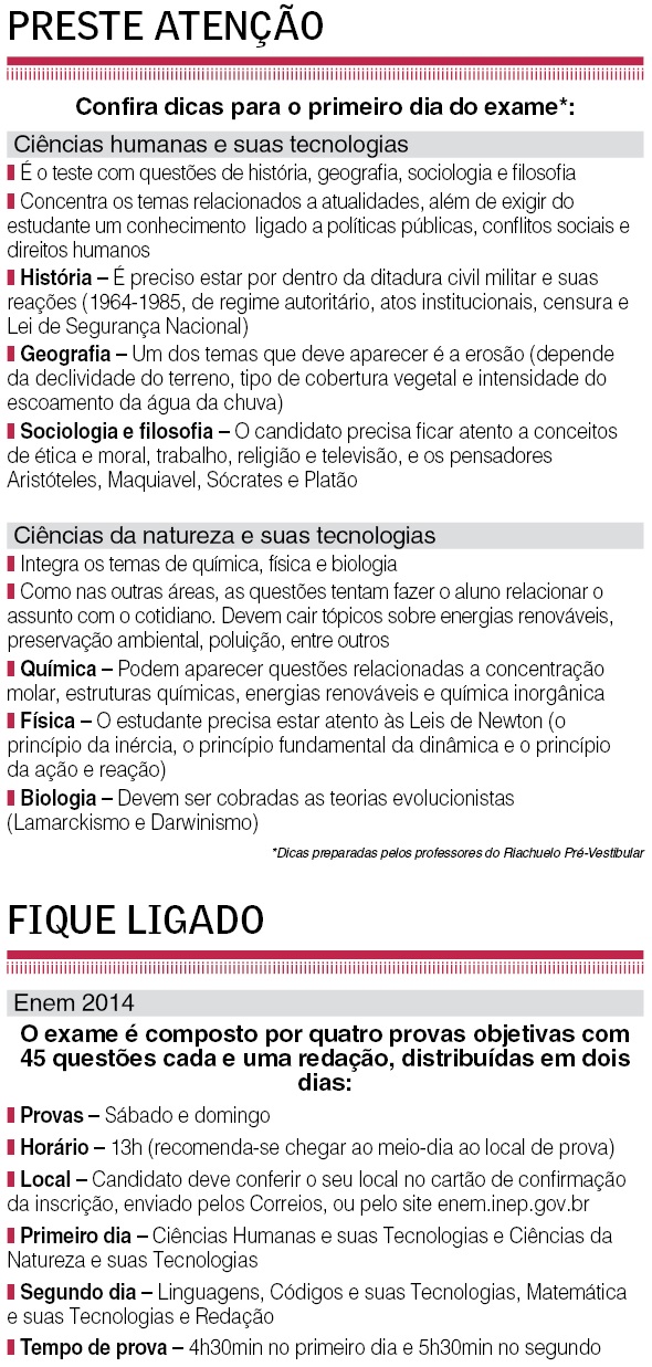 "Na contagem regressiva para o Enem 2014, que será aplicado neste fim de semana, o "Diário" publica dicas de última hora para os candidatos não deixarem de fazer bonito nas provas. Nesta quarta-feira, você confere informações de professores do Riachuelo Pré-Vestibulares referentes ao primeiro dia de Enem. Na quinta-feira, publicaremos dicas para o segundo dia de provas.