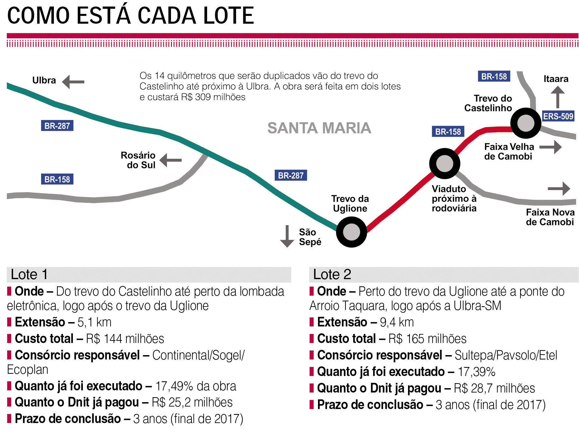 No lote 2, entre a Uglione e o Arroio Taquara, perto da Ulbra, a construtora Sultepa teve de parar as obras, mas por outro motivo. A empresa estava endividada, tinha pendências e ficou impedida de receber recursos federais. A empreiteira conseguiu, então, aprovar a recuperação judicial e, em 3 de agosto, as máquinas voltaram à pista. O Dnit acabou homologando a inclusão da empresa catarinense Pavsolo no consórcio.