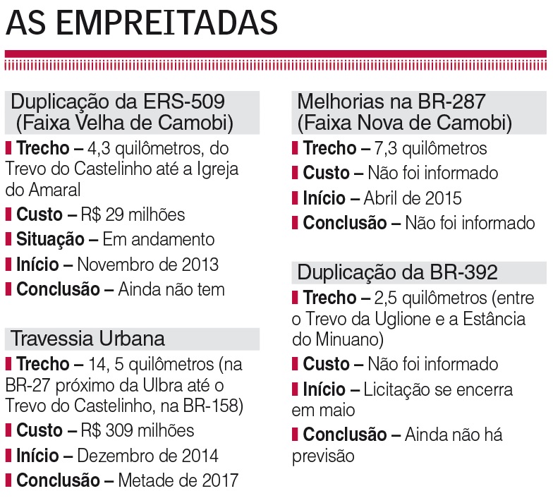 As obras da Faixa Velha, que ficaram paradas por oito meses e ficariam prontas no final deste ano, foram retomadas, ainda sem uma data para conclusão. Ao mesmo tempo, anda a passos largos a construção da travessia urbana, na 287 e na 158. Mas nem sempre a empreitada teve o ritmo acelerado como característica foram 14 meses de espera entre a ordem de serviço e o começo da duplicação na prática.