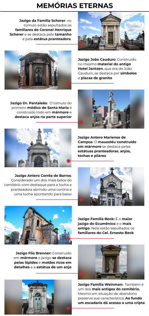 Fundado em 1860, o Cemitério Ecumênico Municipal de Santa Maria é um dos locais que contribui para o registro da história da cidade. No local, estão sepultadas figuras que foram consideradas importantes para o desenvolvimento do município: políticos, militares, advogados, médicos e empresários. Muitos descansam em sepulturas construídas com arquitetura imponente e que hoje fazem do Ecumênico um lugar, que além de memória, de contemplação à arte, proporcionando um outro tipo de experiência para quem irá percorrer o cemitério neste Dia de Finados, celebrado neste domingo.