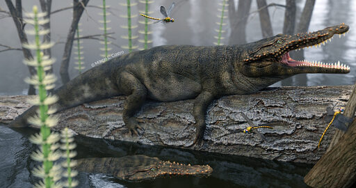 Reconstrução do arcossauriforme Proterochampsa nodosa em seu habitat natural, há 230 milhões de anos