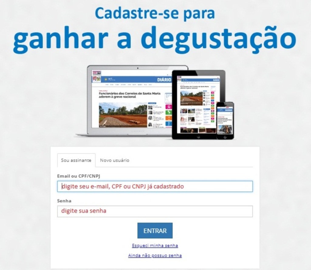 Caros leitores, o site do Diário de Santa Maria passou a adotar sistema de cobrança parcial por seu conteúdo digital, ou seja, no site. Para quem já é assinante do jornal impresso ou do site, nada muda. Apenas é necessário fazer o login que o acesso ilimitado ao conteúdo estará liberado. Veja como fazer no passo a passo abaixo.