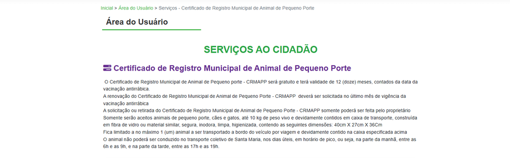 Acesse o site da prefeitura de Santa Maria, vá até a aba "Serviços Online" e procure a seção "Meio Ambiente / Saneamento" e selecione a opção "Certificado de Registro Municipal de Animal de Pequeno Porte".