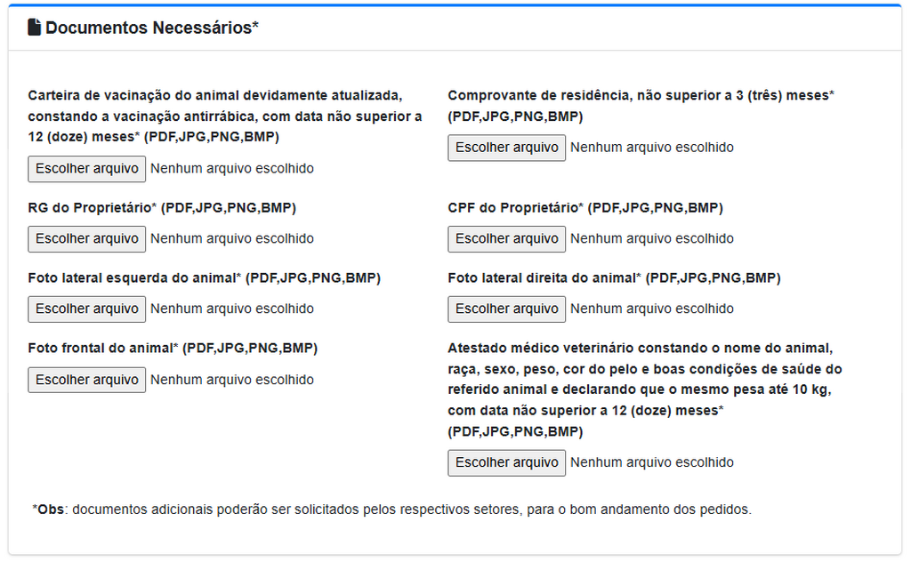O embarque só será liberado com a apresentação do Certificado de Registro Municipal de Animal de Pequeno Porte (Crmapp), emitido pela Superintendência de Bem-Estar Animal. O documento tem validade de 12 meses a contados da data da vacinação antirrábica.