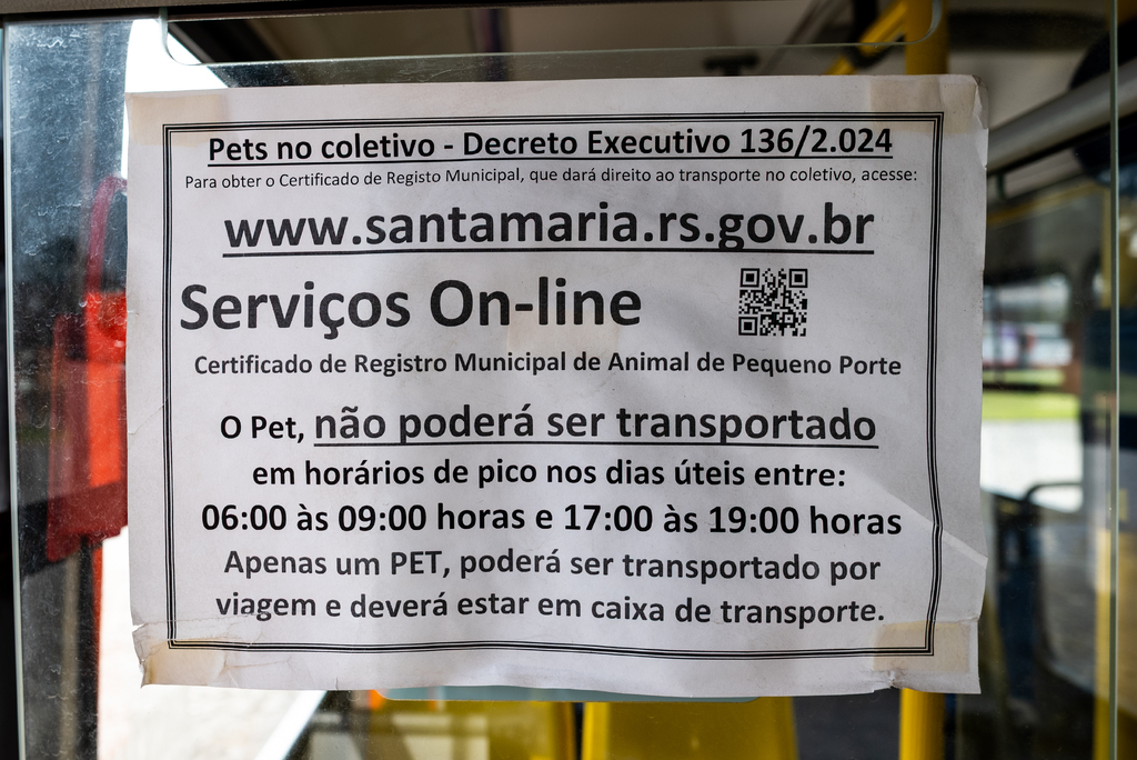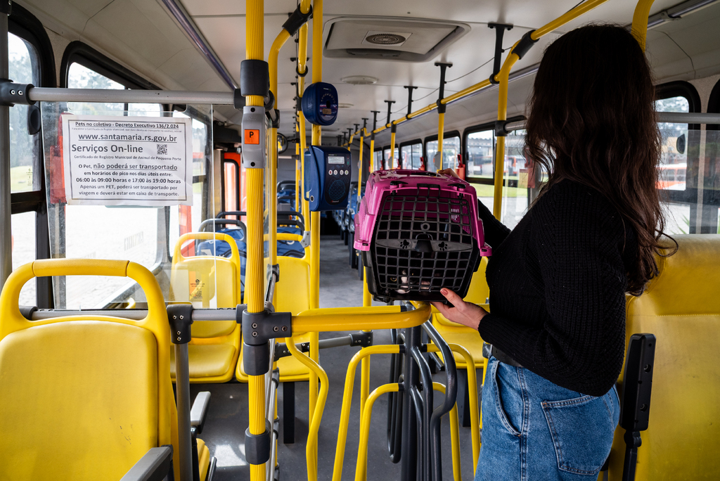 Está em vigor a regulamentação da lei municipal que permite o transporte de animais domésticos nos ônibus de Santa Maria. Agora, tutores de cães e gatos de pequeno porte podem levar seus pets no transporte público, desde que algumas regras sejam seguidas. Será permitido apenas um pet por viagem e, para evitar superlotação, o embarque é proibido nos horários de pico: das 6h às 9h e das 17h às 19h, nos dias úteis.