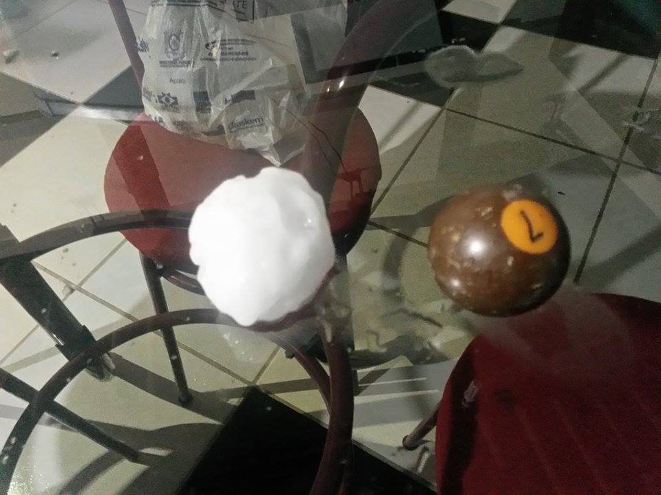 Guilherme Chuma, de Rosário do Sul, enviou a foto da pedra de gelo que perfurou o telhado da sua garagem