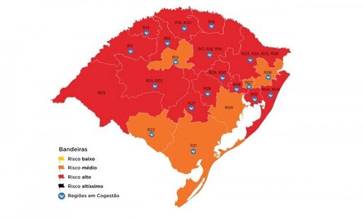 Conforme a classificação prévia, 15 das 21 regiões estão alto índice de contágio do coronavírus e de ocupação dos hospitais por pacientes com Covid-19 – o que indica a bandeira vermelha. Apenas Guaíba, Taquara, Novo Hamburgo, Cruz Alta, Pelotas e Bagé apresentaram risco médio – de bandeira laranja.