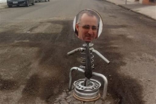 As ruas esburacadas em Santa Maria, que tiveram o problema intensificado com as chuvas da semana passada, também viraram assunto de polícia nesta segunda-feira. É que na esquina das ruas Castro Alves e Sete de Setembro, no Bairro Perpétuo Socorro, um boneco feito com peças de veículos danificados e já popularizado como Jorgito, em referência ao prefeito Jorge Pozzobom (PSDB), foi instalado no local.