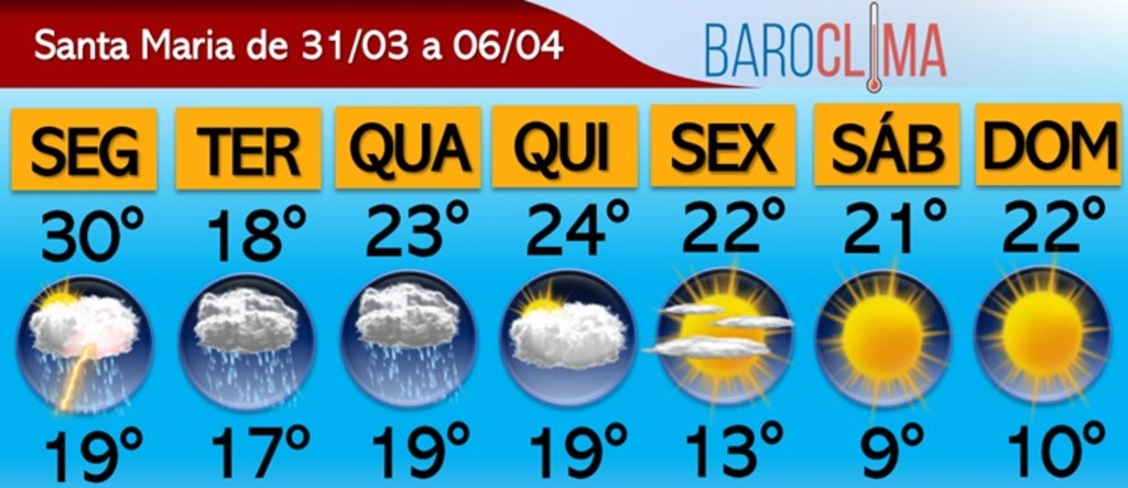 Segundo a BaroClima, na segunda-feira, os ventos que sopram antes da chegada da frente fria favorecerão uma manhã e início da tarde de temperatura elevada em Santa Maria. No entanto, a partir da tarde, o tempo deve mudar com o avanço de uma frente fria, que trará chuva, ventania e queda acentuada de temperatura. O dia será marcado pela famosa "mínima invertida", que ocorrerá à noite e não pela manhã.