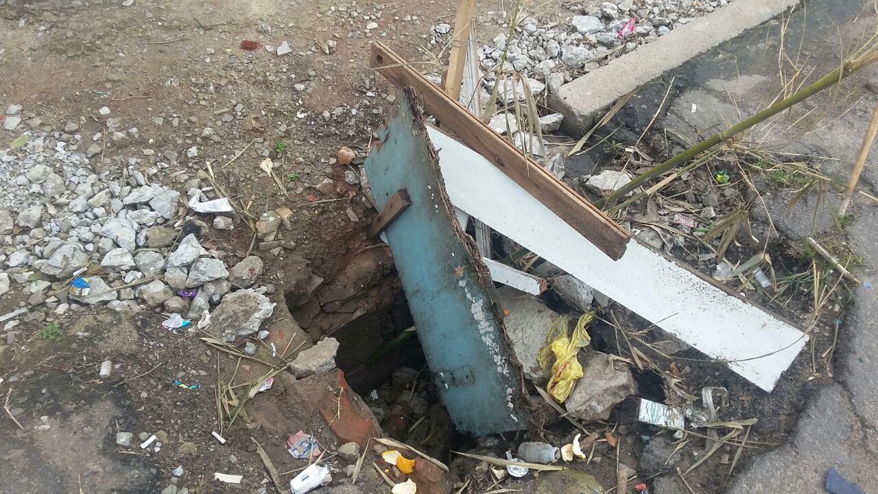 Eu registrei protocolo no dia 31 de março de 2014. Desde lá, estou tentando contato com a Secretaria de Obras para que possam fazer o conserto do bueiro. A Corsan já esteve aqui e disse que er"