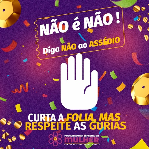 A Procuradoria Especial da Mulher do Legislativo de Santa Maria lança, nesse período de Carnaval, a campanha “Não é não – diga não ao assédio”, motivada, principalmente, pelos crescentes casos de crimes sexuais e outras formas de importunação contra a mulher nos últimos anos.