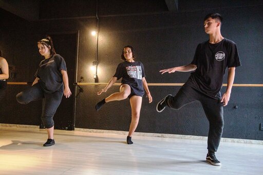 A professora de dança Luiza Peixe se diverte com as alunas de 7 a 12 anos da turma de danças urbanas