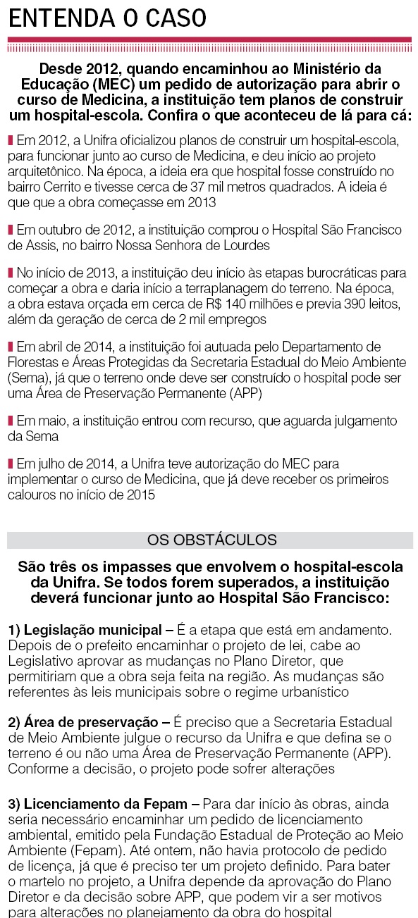 A Câmara de Vereadores de Santa Maria devolveu à prefeitura o projeto de lei de autoria do Executivo que altera regras urbanísticas para permitir a ampliação do Hospital São Francisco, que deve servir de hospital-escola para o curso de medicina do Centro Universitário Franciscano.