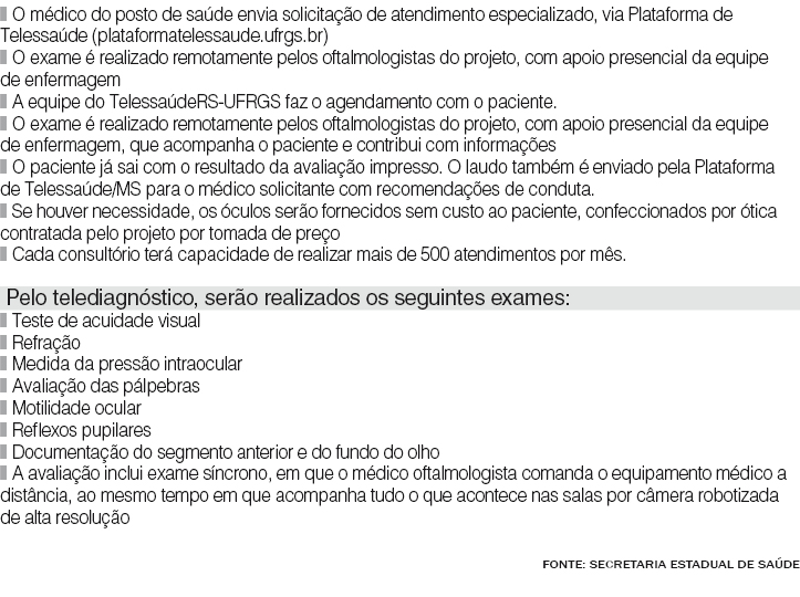 Pacientes com doenças como glaucoma e retinopatia diabética, muitas vezes ainda não diagnosticadas, terão prioridade no encaminhamento ao oftalmologista. Durante as consultas, uma equipe de médicos e enfermeiros irá transmitir os exames para uma central, em Porto Alegre.