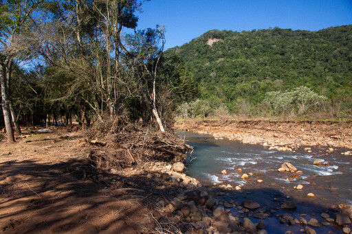 Já na parte dos fundos, que fica às margens do Arroio Grande, uma parte da encosta foi levada pela água. Com isso, o terreno perdeu cerca de 10 metros de extensão e, agora, indica perigo de novos desmoronamentos de terra. O proprietário Gleison Zimmermann, 44 anos, conta que o balneário perdeu mais de 30 churrasqueiras, lixeiras de lixo e metros de fios de luz, levados pela correnteza.