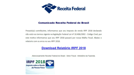 A Receita Federal informou, nesta segunda-feira, sobre um e-mail falso que tem circulado em nome da instituição. Na mensagem, é solicitado que o contribuinte faça o download do relatório do Imposto de Renda (IR) de 2018 devido a um problema na declaração. Entretanto, segundo a instituição, não são feitos quaisquer tipos de comunicados via e-mail. Por conta disso, órgão acredita se tratar de um possível golpe.
