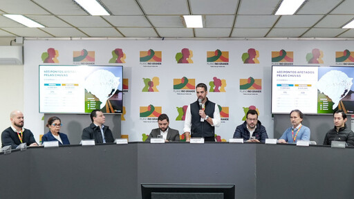 A coletiva foi realizada no Centro Administrativo de Contingência, em Porto Alegre, e contou com a presença dos secretários de Logística e Transportes, Juvir Costella, e da Reconstrução Gaúcha, Pedro Capeluppi.