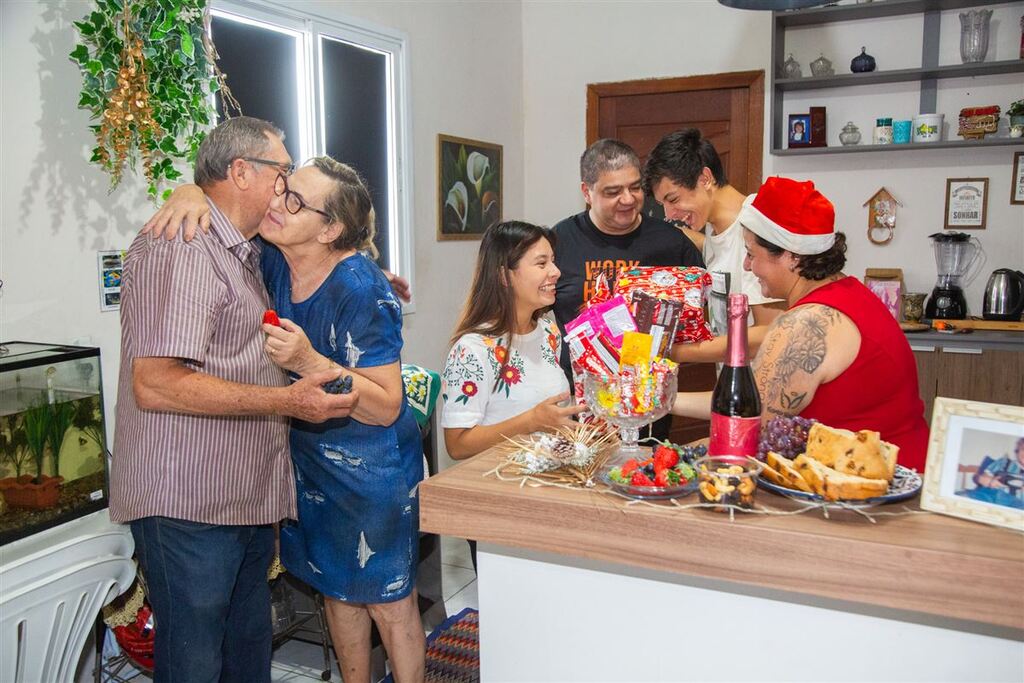 No apartamento, o militar aposentado Simão Wastchuk, 75 (camisa listrada), e a professora de português aposentada Noélcia Wastchuk, 72 (vestido azul), admiram a decoração natalina feita pela filha. Entre risadas, abraços e presentes, novas lembranças de Natal vão se formando. Fotos e pertences antigos de Fabrício, como um boné favorito, reforçam o sentimento de união da família. Para Nóelcia, a celebração do Natal tem sido um importante passo no processo de luto.
