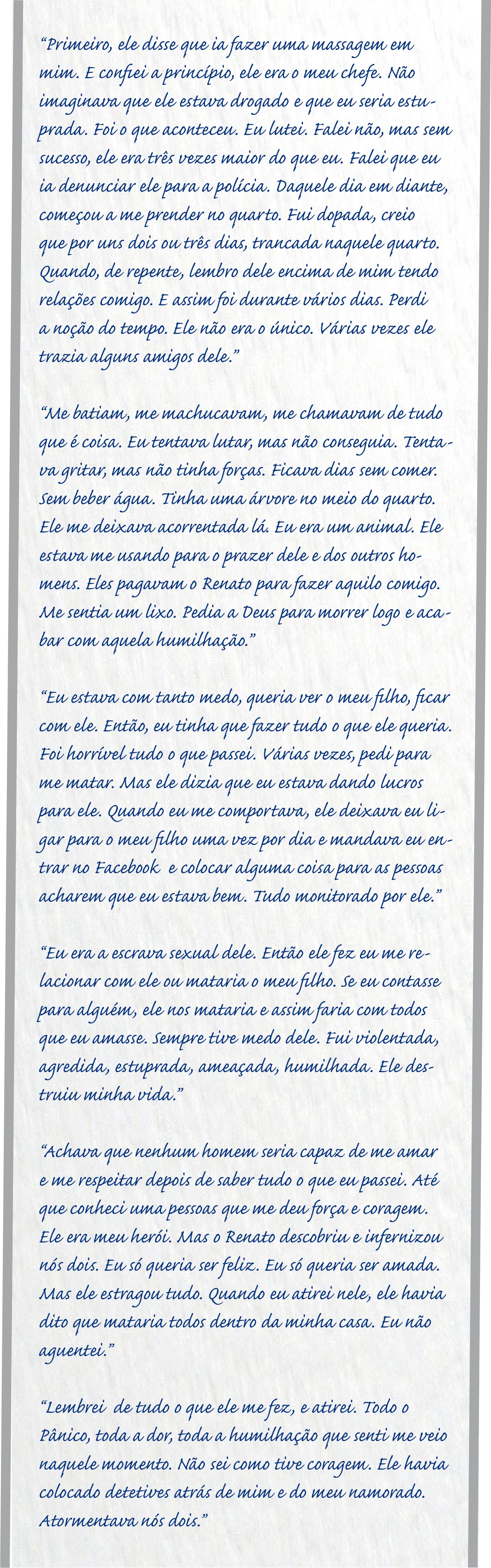 "Meu nome é Ana Raquel Santos da Trindade. Estou, no momento, presa no Presídio Feminino de Florianópolis. Tenho 29 anos e aguardo julgamento por homicídio... Minha história começa em fevereiro, ou início de março de 2013. Creio que agora que o Renato morreu posso correr o risco de contar o que eu vivi".