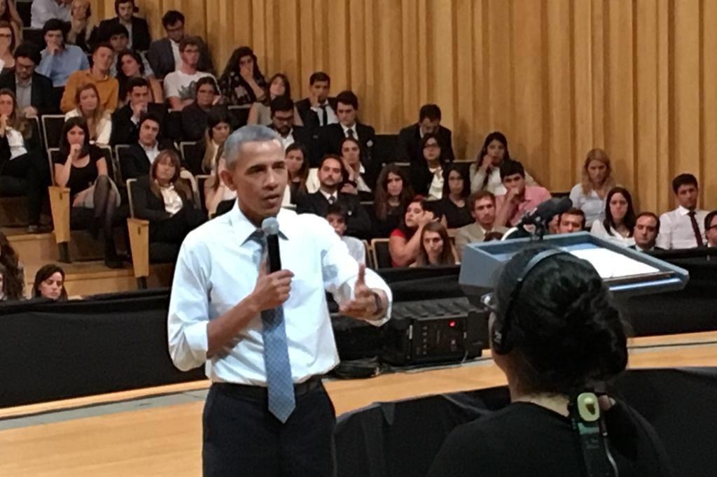 Ao fim do encontro, Obama foi cumprimentar quem estava na primeira fila. Gabriel foi um dos felizardos. Durante o aperto de mãos, uma rápida conversa.