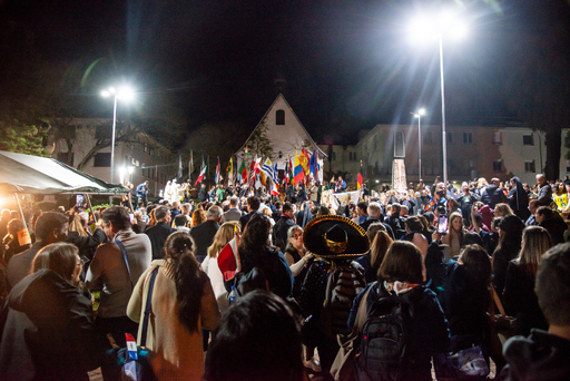 A programação começou às 18h30min, no Centro Mariano, em frente ao Santuário Tabor, Avenida Dores. Sob um grande toldo, mesas separadas por país acomodavam os peregrinos. Entre as mesas o espaço era apertado, mas isso não diminuiu o entusiasmo. Foram servidos sanduíches, caldos quentes e, para acompanhar, Guaraná Cyrilla, produção santa-mariense — até porque não poderia ser diferente. Em cada mesa, um enfeite de uma imagem de Pozzobon ao lado de um burro, em referência ao apelido 'Burrinho de Maria', dado pelo esforço com que caminhava levando a imagem. Embora tenha surgido de forma maldosa, ele não recusou o apelido o apelido, porque acreditava que qualquer sacrifício valia a pena se fosse pela Mãe.