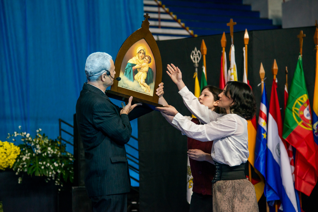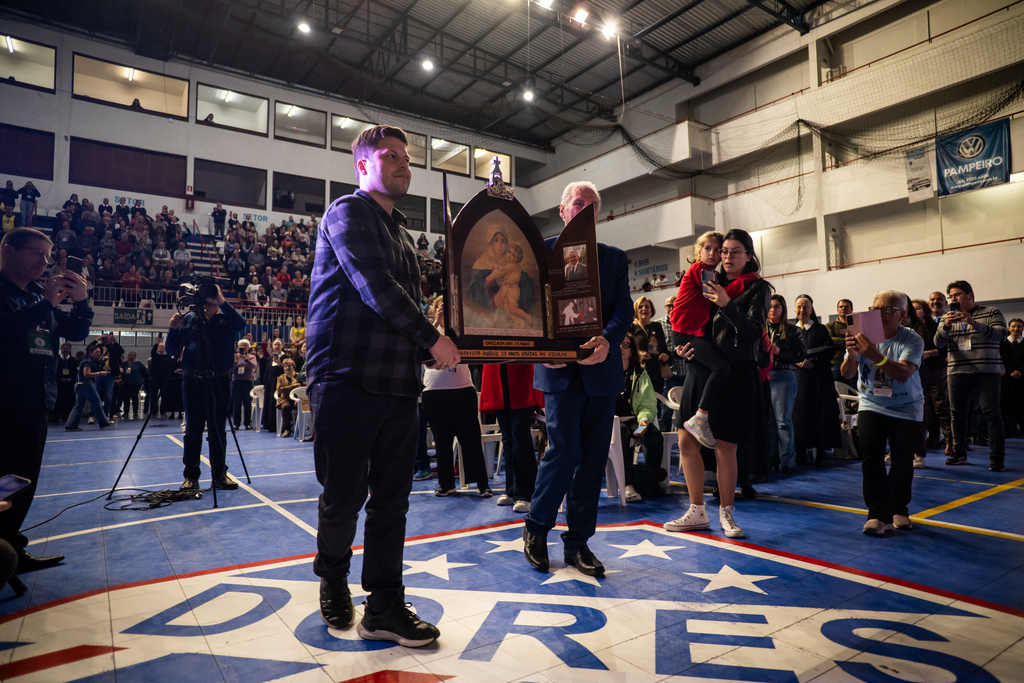 Depois das entradas das bandeiras dos países e das falas iniciais, veio a entrada da imagem Peregrina. Quem entrou segurando a imagem foram Humberto Pozzobon, filho do diácono, e o neto João Luiz Pozzobon, que nasceu no mesmo dia que ele.