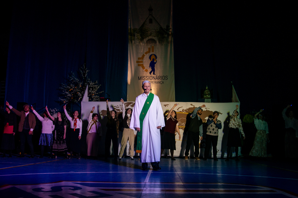 Depois, história de Pozzobon foi dramatizada por um grupo que cantou, dançou e reviveu sua trajetória desde a entrada no Movimento de Schoenstatt em 1947, a ordenação como diácono e a missão de levar a Mãe Peregrina por tantas famílias.