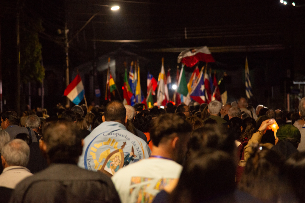Os fiéis estavam uniformizados: alguns em trajes típicos de seus países, outros com bandeiras enroladas no corpo. A maioria carregava a Mãe Peregrina, algumas usavam até capas personalizadas para não molhar ou sujar. Eram visíveis o cuidado e o respeito.