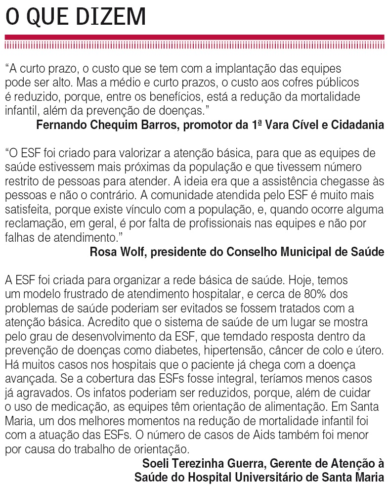 Segundo o portal da transparência do município, há hoje 304 vagas criadas em Santa Maria e 148 delas não estão preenchidas. Os dados são de maio de 2015. E foi justamente em função do baixo número de equipes (e de profissionais) dos ESFs que, no final de julho, o Ministério Público ajuizou uma ação contra a prefeitura que, agora, tem 60 dias para explicar porque tem 16 grupos trabalhando no programa e não 44, o número previsto em 2004, quando as ESFs foram implantadas.