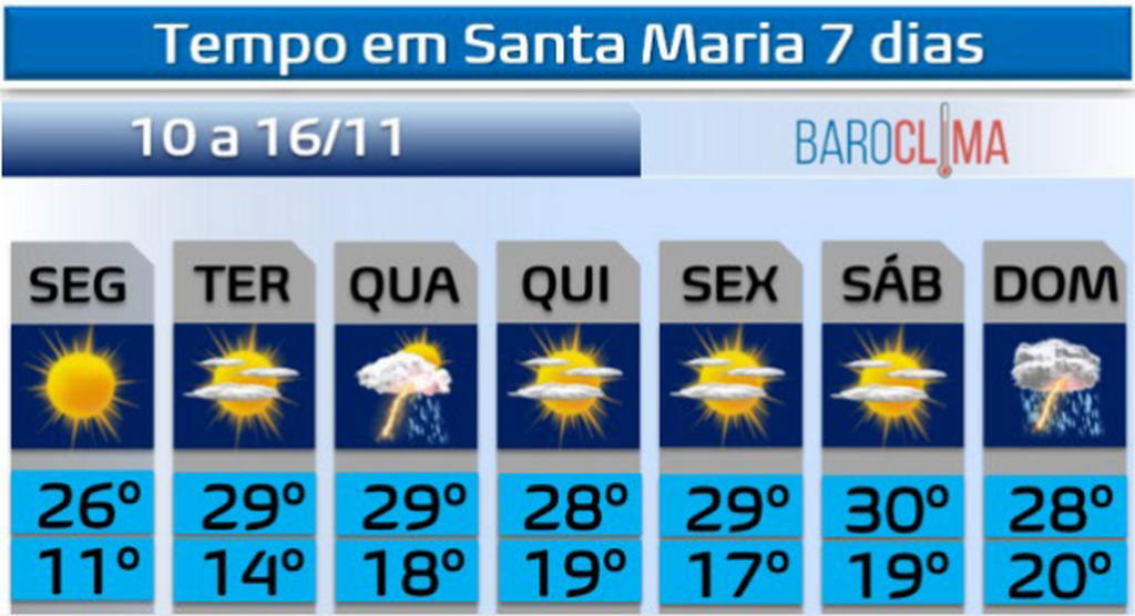 De acordo com Verardo, uma massa de ar seco mantém a estabilidade atmosférica sobre o Rio Grande do Sul, garantindo uma semana de sol e tempo firme. Para a terça-feira (11), a previsão é de mínima de 14°C e máxima de 30°C, com calor mais acentuado à tarde.