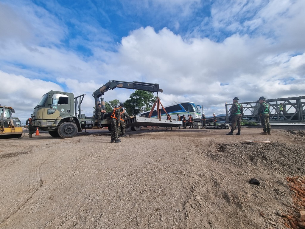Começou neste sábado (19) a montagem da segunda ponte móvel no km 226 da RSC-287, em Santa Maria. Nesta etapa, 95 militares do Exército trabalham na instalação da estrutura, que deve durar de 10 a 15 dias. O tráfego pela ponte, que deve amenizar as longas filas no trecho, está previsto para ser liberado no final de outubro.