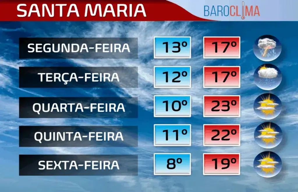 A semana começa com tempo instável em Santa Maria e região. De acordo com o meteorologista Gustavo Verardo, da BaroClima Meteorologia, a passagem de um sistema de baixa pressão deve causar chuva de intensidade moderada, com possibilidade de granizo e trovoadas, ao longo de toda a segunda-feira (8). Os volumes acumulados podem ultrapassar os 50 milímetros na maioria das cidades do centro do RS.