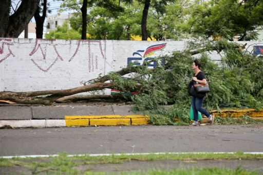 Na Avenida Borges de Medeiros, uma árvore caiu sobre a calçada. Ninguém se feriu. O Corpo de Bombeiros registrou mais de 20 ocorrências de queda de árvores, postes e fios de luz ao longo do dia.