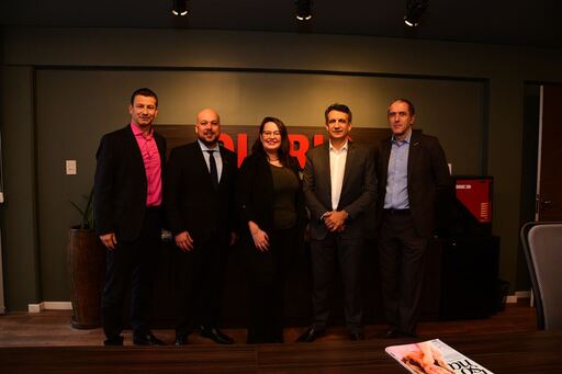 Da esquerda para a direita: Rui Castiglia, Gerente Executivo do Sindicato; Giuliano Vendrusculo, sócio do Diário; Felipe Faccioni, Vice-Presidente de Trabalho e Relações Sindicais; Paula Dahmer, Vice-Presidente Ensino e Educação e Luiz Carlos Teixeira de Oliveira, Diretor Regional do Sindicato. Foto: Eduardo Ramos