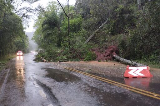 - No km 26, em São Valentim do Sul, houve deslizamento de parte da pista. O fluxo está em meia pista.