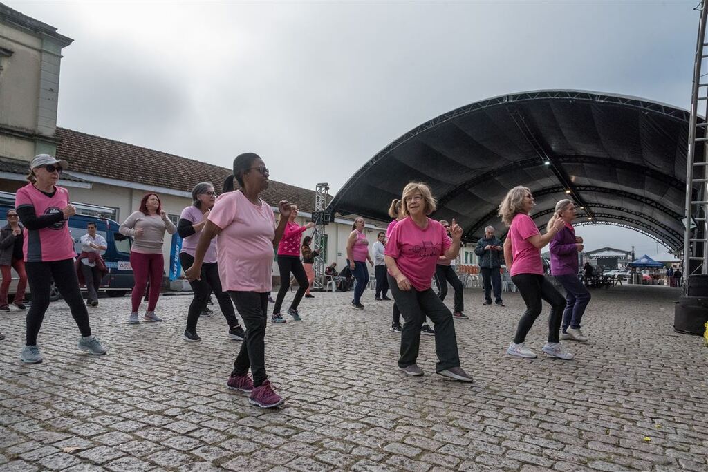 A programação começou com o aulão fitness e, para colaborar, o sol apareceu para fazer companhia e iluminar as cerca de 20 dançarinas que participaram da atividade promovida pela secretaria de Esporte e Lazer do município. A artesã Beatriz Schneider, 56 anos, que estava acompanhada das amigas e artesãs Celma Flores, 67 e Elisângela Marcílio, 50, participou do aulão com entusiasmo: