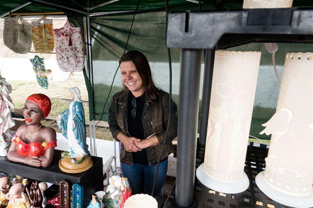 Cucas, salame, queijo, artesanatos e outros produtos feitos por comerciantes locais foram algumas das atrações da entrada da feira. Atuante na Associação de Artesãos do Rio Grande do Sul, a artesã Patrícia Pedron, 48 anos, também se fez presente no evento. Antigamente, ela trabalhava na produção e venda de lanches folhados, mas quando viu o trabalho de outros artesãos, decidiu mudar de ofício e segue na nova profissão há 8 anos: