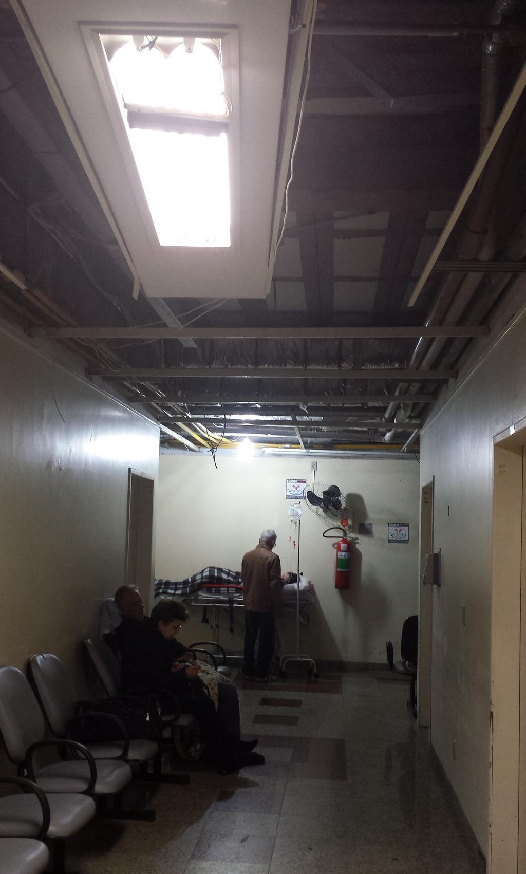 Rogener DOliveira está revoltado com o caos no local. A mulher dele e outros 19 pacientes estão no corredor, que segue sem a forração do teto há mais de um mês. Ele conta que, na madrugada de quinta para sexta-feira, não conseguiram nem dormir, pois há frestas e um vento muito gelado circulando pelo corredor. Ele reclama ainda do risco de contaminação e de acidentes, pois há fios caídos do teto e luminárias presas por arames.
