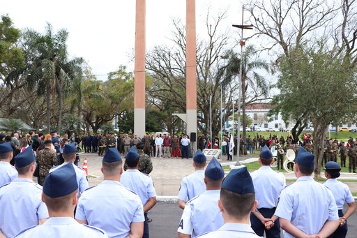 A Praça General Osório, mais conhecida como Praça do Mallet, foi palco, na tarde deste domingo (1º), da solenidade de abertura da Semana da Pátria 2024 em Santa Maria. A cerimônia teve início às 16h, com o hasteamento das bandeiras do Brasil, do Rio Grande do Sul e de Santa Maria ao som do Hino Nacional. Estiveram presentes o comandante da 3ª Divisão de Exército (3ª DE), general Paulo Roberto Rodrigues Pimentel, o prefeito Jorge Pozzobom (PSDB), o presidente da Câmara de Vereadores, Manoel Badke (União), além de autoridades civis e militares.