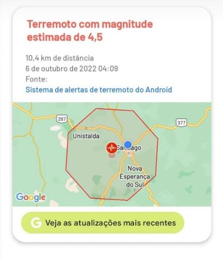 – Achamos muito curioso o fato das pessoas receberem esse alerta do Google e até fomos em busca de entender como funciona. Santiago de fato é uma das cidades do Rio Grande do Sul com maior incidência de raios e é comum que os estrondos causem a sensação de tremor. Mas, ainda que tenha sido forte, não se compara ao de um terremoto. Além disso, geograficamente, o Rio Grande do Sul não tem histórico de terremotos – explica Paulo Acosta, diretor da Defesa Civil de Santiago.