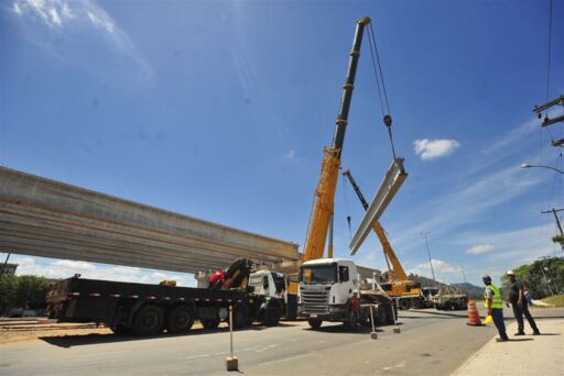 O içamento de vigas nas cabeceiras do viaduto começou na manhã de sábado. Durante a noite, não houve interrupções.