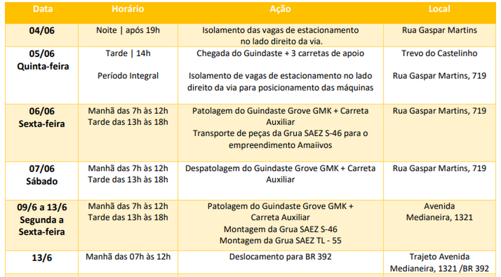Já entre a próxima segunda (9) e sexta-feira (13), movimentação se dará no canteiro de obras do empreendimento Amaiivos, na Avenida Medianeira. Nesse caso, segundo informado pela construtora, não devem ser feitos bloqueios no trânsito por períodos extensos.