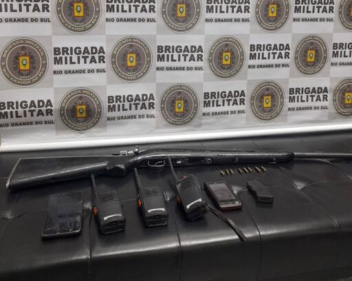 Após a abordagem e identificação dos ocupantes da camionete, os policiais encontraram durante revista veicular, um rifle calibre 22, munições, rádios comunicadores, facas, cordas, uma, chaira, lanternas, um machado, e aparelhos celulares.
